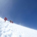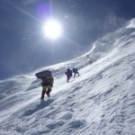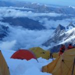 A 5 h du matin, nous nous extirpons de notre tente pour monter directement au camp 3. La majorité du camp est encore endormie et nous avons la voie pour nous. Après une sieste au camp 2, nous continuons jusqu’au 3. Rebelotte, la tente est totalement enfouie sous la neige mais étant plus haut, la neige et beaucoup plus légère et la tente n’est pas abimée. Quelques heures plus tard, nous accueillons le reste du groupe avec des pop-corn et du thé. Je consulte Yan pour la suite, “un peu de vent entre 7000 m et 7500 m mais rien de méchant”, selon lui…