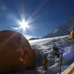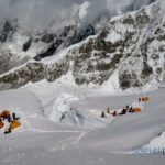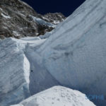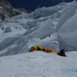 Direction le Camp 3 en compagnie de Herbert, Noel et NaDorjee. Devant ce monstre de glace, difficile de comprendre l’itinéraire. NaDorjee qui était là en 2015, nous dit que le glacier a énormément changé et que l’ancienne route n’est plus praticable. Cette année la voie est plus longue et plus dure. Itinéraire magnifique, sauvage entre crevasses et séracs, petites fourmis au milieu de ce géant blanc. 5 heures et 690 mètres de dénivelés plus tard, nous voilà installés au Camp 3 à 6890 m.