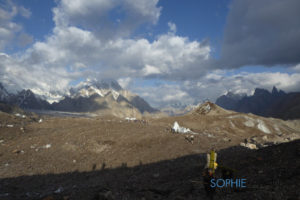 Le jour suivant le camp de base du Broad Peak et enfin notre camp de base ! Le K2 est sous les nuages. Au total se sont 2000 m de dénivelés avec des étapes de 6 à 11 heures avec une moyenne d’une vingtaine de km sur moraine et glacier chaotique. J’avoue que cette année il m’a été difficile d’apprécier la beauté des tours de Trango, du Masherbrum, du G4 et le paysage mythique du Baltoro. Mettre un pied devant l’autre et atteindre le camp de base pour dormir et enfin récupérer !!…