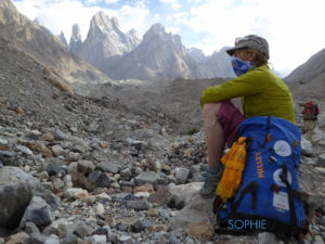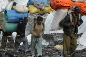 1ère nuit sous tente que je partage avec François à Askoli, réveil 4h30, pt dej 5h, départ 5h30 pour notre première étape Jola. Puis Paiju où nous passons 2 nuits pour permettre aux porteurs de réorganiser leurs charges et de répartir leur nourriture pour les prochains jours où nous serons sur le glacier du Baltoro. Le matin du départ pour Urdukas, l’étape la plus longue, je me réveille avec un ventre tout gonflé et douloureux qui m’impose un chapati et une tasse de thé en tout et pour tout comme petit déjeuner. A peine partis, c’est la diarrhée qui se déclare et une demi heure plus tard, je vomis le peu qui me reste dans le ventre… Une gorgée d eau ou de coca et hop ça ressort instantanément. La chaleur m’inquiète, il faut mettre un pied devant l’autre et avancer. 6 heures plus tard accompagnée de François, Youssouf, Nima et Muhammad, nous arrivons péniblement à l’étape du lunch. Je m’endors épuisée, vidée. Le guide argentin de l’expé du Broad Peak vient me proposer des médicaments que j accepte volontiers car la journée n’est pas terminée. Intoxication alimentaire, à l’eau, gros coup de fatigue, je ne sais pas. 4 heures plus tard, à Urdukas, je m’écroule dans ma tente jusqu’à 4h30 pour continuer, vidée comme un poulet, jusqu’à Gore2 . Le matin je trouve du coca salvateur à acheter à un porteur que je conditionne précieusement dans une bouteille en plastique. Dans la matinée, je sens le bas du dos et mon pantalon qui commence à ruisseler, ce n’est pas la transpiration, la pression et l’altitude a fait sauter le bouchon. L’intégralité du contenu de mon sac se retrouve poisseux trempée au coca. Je ne sais pas comment je n’ai pas pleuré !?