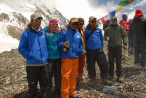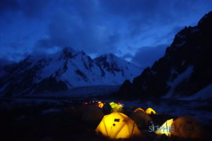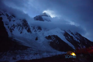 Les sherpas effectuent également des rotations pour fixer les cordes, monter les tentes dans les camps et commencer les dépôts de bouteilles d’oxygène. L’équipe népalaises (Ganza, Lale, Passang, Tashi, Mingma et Shawang) monte en altitude pendant que l’équipe pakistanaise (Muhammad, Nazir, Nabi, Akbar et Fadi) est au BC et inversement. Ils font un travail fantastique. Aujourd’hui, Akbar, Fadi et Nima ont consolidé ma tente qui avait déjà bougé en une semaine du aux mouvements du glacier. J’ai une tente 7 stars now !!… pour le camp de base du K2, il faut bien ca !… Sachant que l’on n’a pour ainsi dire encore pas vu la montagne. On sent cette masse imposante proche de nous mais pour être très franc, les nuages dansent devant tout le temps et nous empêchent encore d’en apprécier sa beauté… Patience… Patience…