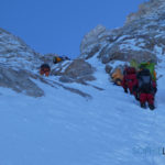 Nous nous retrouvons au lever du jour juste derrière eux. Tout le monde est motivé mais la progression est très lente.  Cette montagne est gigantesque et difficile, la partie technique en mixte sont les 300 derniers mètres.